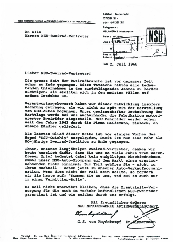 Am 2. Juli 1968 war Schluss mit Lustig bei NSU. Die NSU-Zweirad-Vertreter wurden informiert, dass eine über achtzigjährige Zweirad-Tradition nun zu Ende gegangen sei.