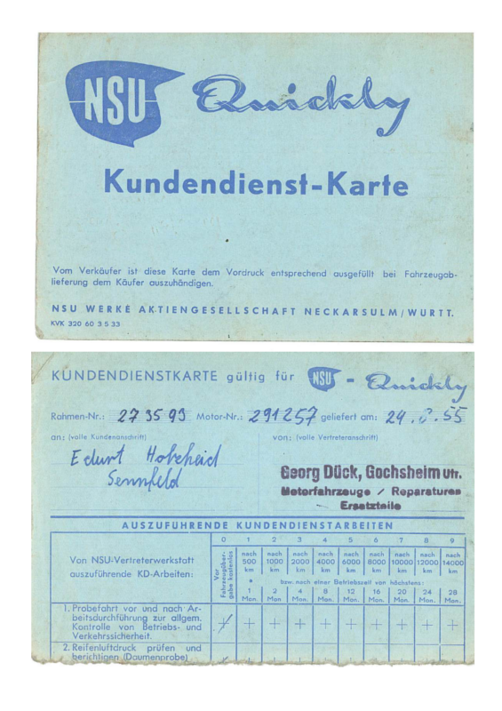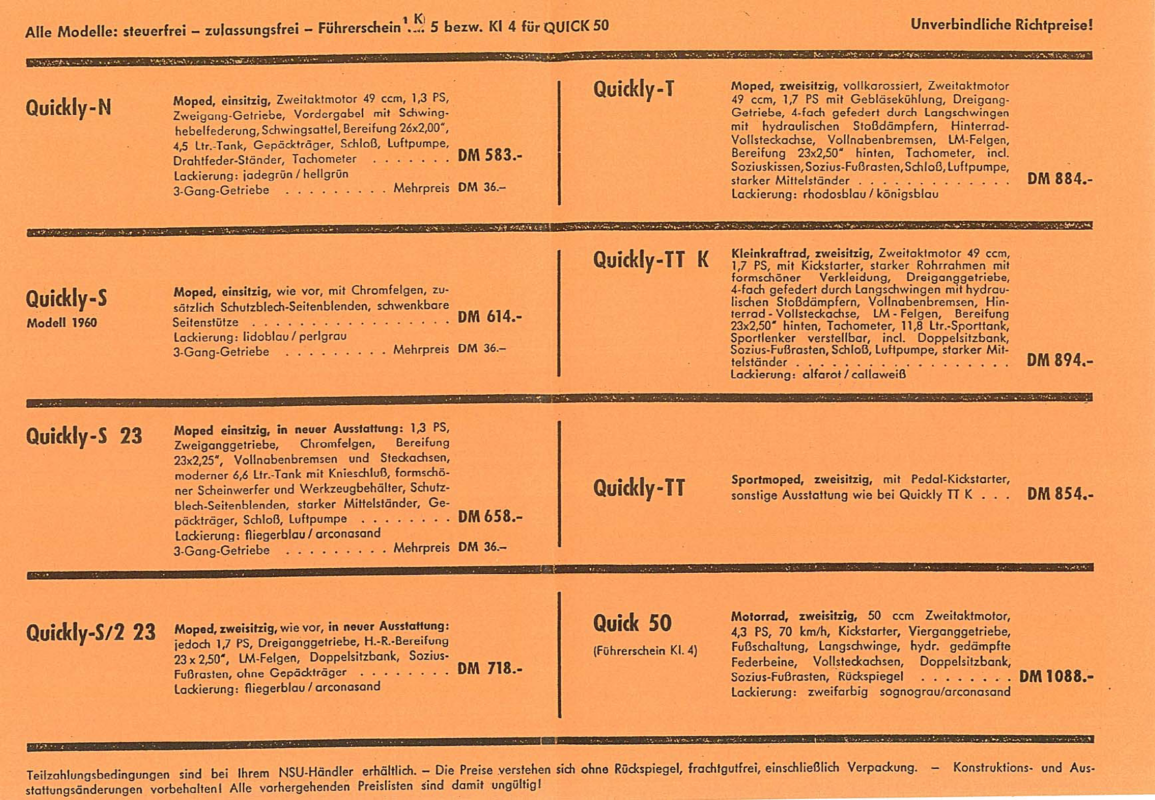 Bis zur Einführung der Führerscheinklasse V war auch keine Fahrerlaubnis notwendig. Allein die Vollendung des 16. Lebensjahres reichte aus. Im Bezug auf die NSU Quick und deren “Vater” Albert Roder wurde in der Pressemappe der jüngste Spross, die NSU Quickly vorgestellt. Quickly steht im englischen für “flott”, was für den Exportmarkt somit von doppelter Bedeutung war. Ebenfalls zu dieser Zeit wurde der Spruch “Nicht mehr laufen, Quickly kaufen” geprägt. Dieser Spruch sollte hunderttausende von Menschen zum Kauf einer